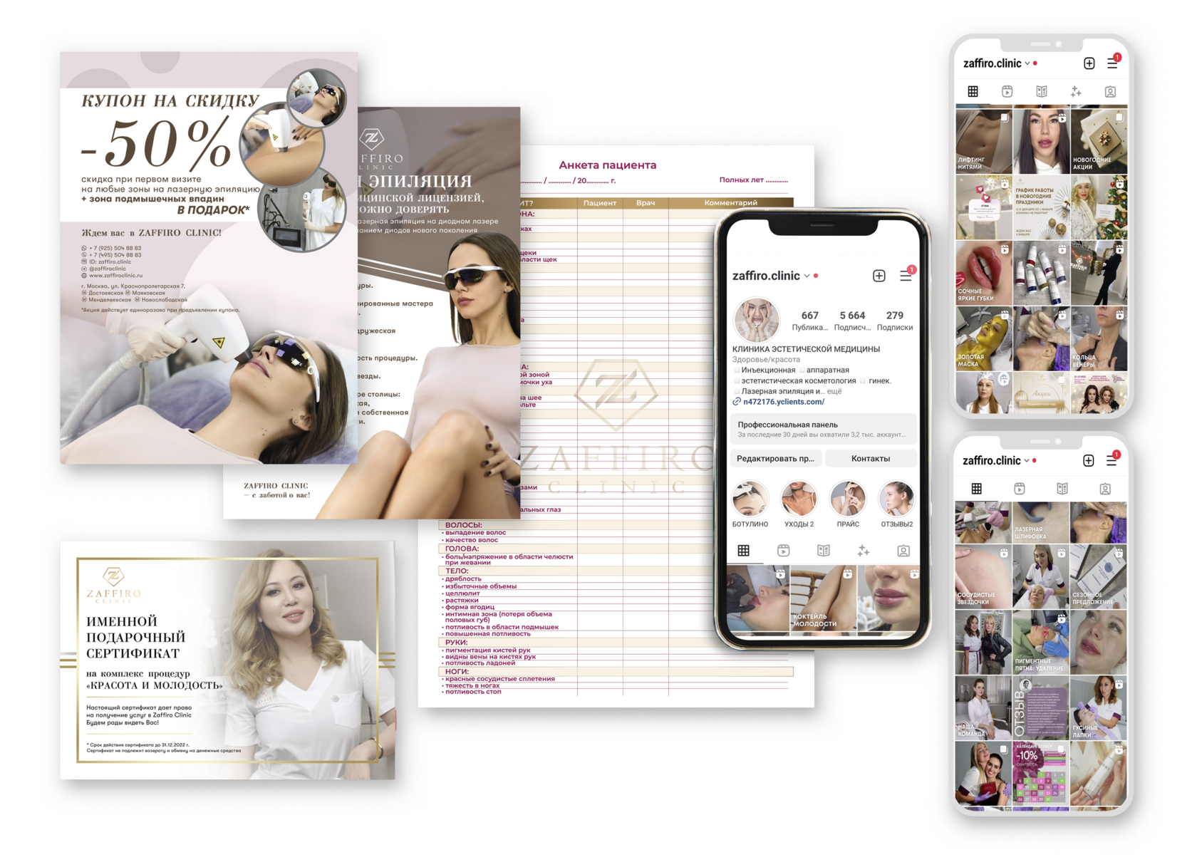 Работа над проектом Zaffiro Clinic – это многолетний труд. За последние 5 лет мы создали огромное количество макетов и креативов для проекта.